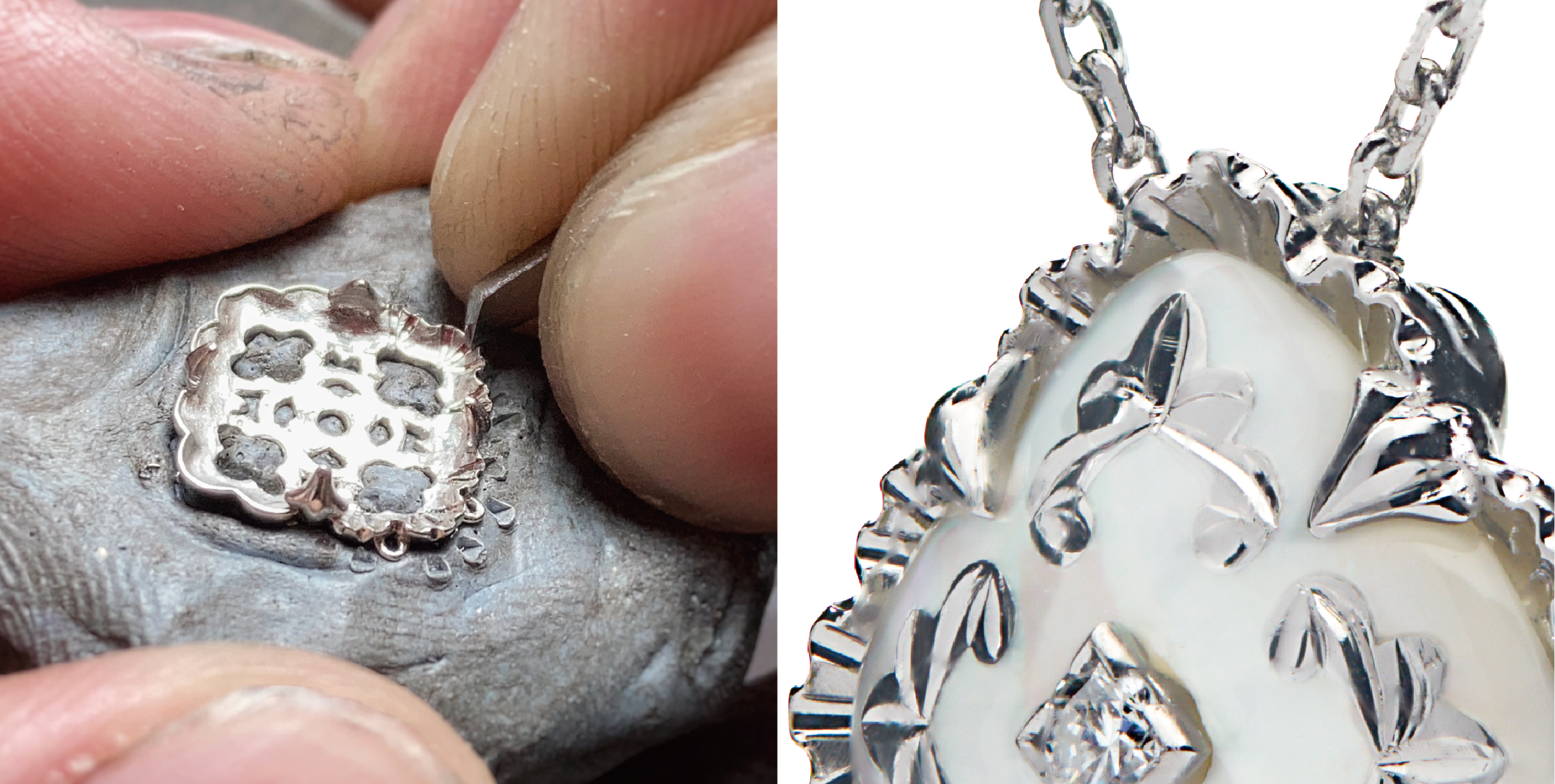 そんな歴史を持つレースを表現するため、今作では硬い貴金属を彫金技術を用いて彫り崩すことで繊細さと優雅さを表現する事に挑みました。